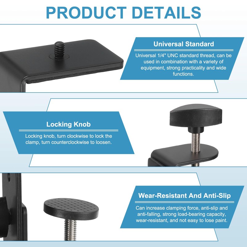 - The universal C-clamp adopts a U.S. standard 1/4"-20UNC male thread, widely used in base swing arm desk lamps, mobile phone holders, microphone holders, tablet holders, lamp cantilever holders, cameras, shelves, gooseneck, etc.