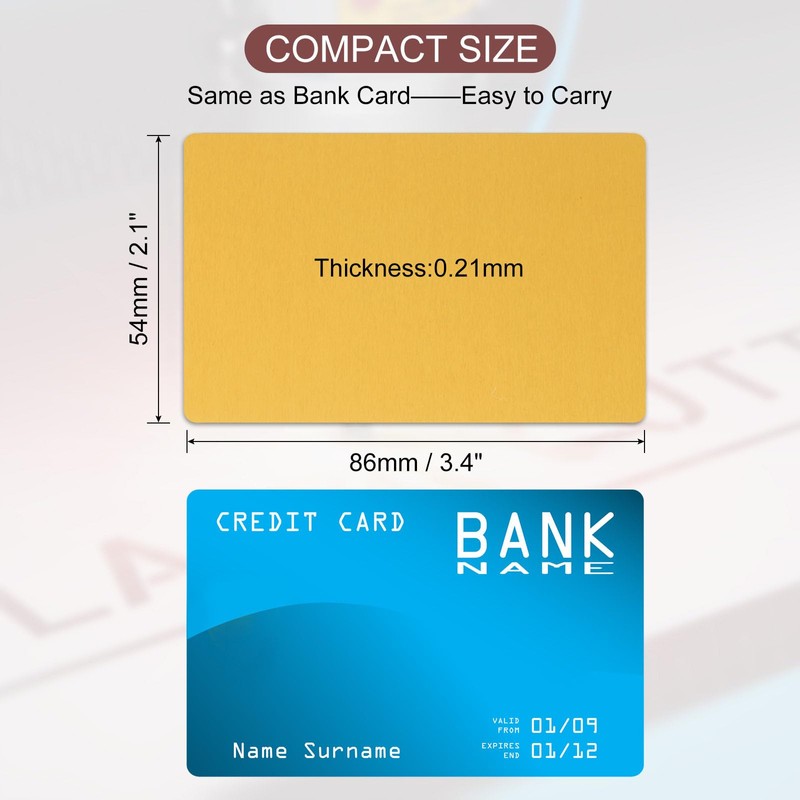 - Blank business card size: the quantity is enough to meet your daily needs. We offer 100 pieces blank metal business cards. The thickness is 0.21 mm and measures 3.4 x 2.1 inches (86 x 54 mm). As it is the size of a credit card, it is compact and portable.