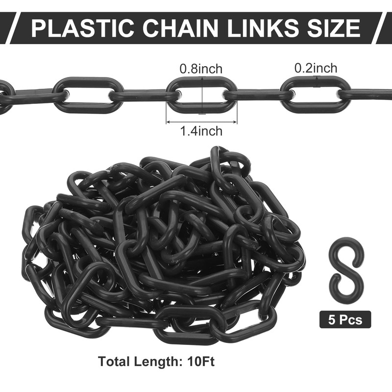 - Size: The total length of the plastic chain links is 10 Ft(3 Meter), and each individual link measures 1.4 x 0.8 x 0.2 inches/35 x 20 x 6mm(L*W*H), Color Black.