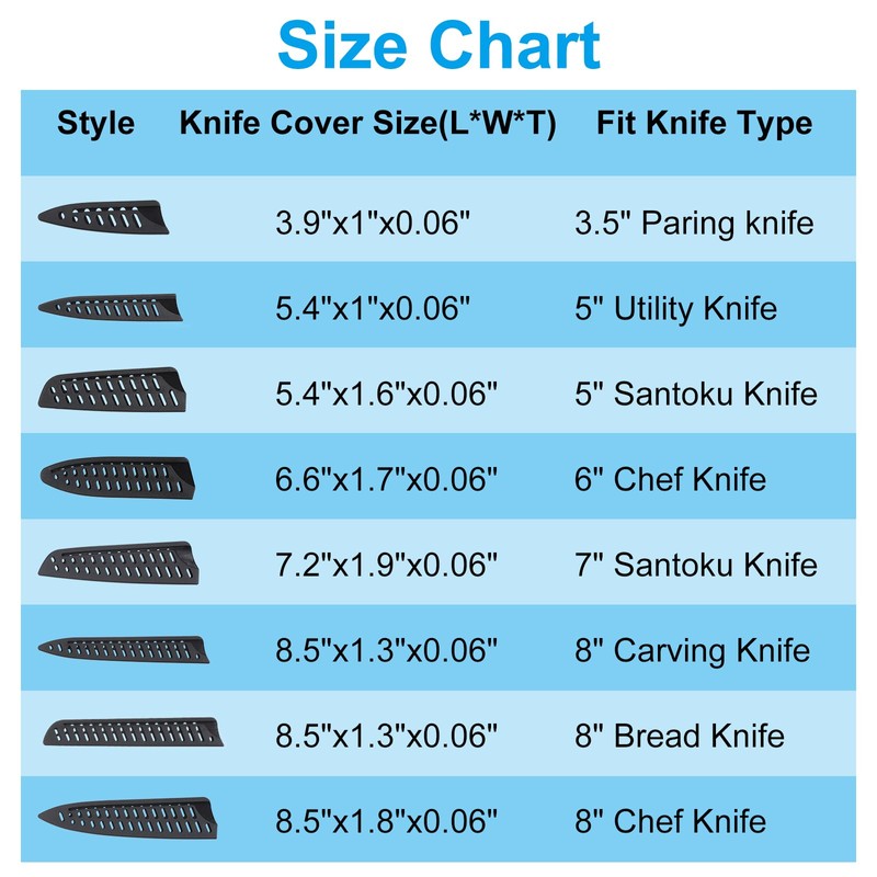 - Fit Knife Type: 8" Chef Knife; Color: Black; Size: 215 x 45 mm / 8.5 x 1.8 inch (L*W); Packing List: 5Pcs x Knife Edge Guards