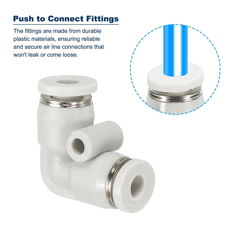 - Advantage: The fittings are made from durable plastic materials, ensuring reliable and secure air line connections that won't leak or come loose. These white fittings have a 5/32 inch OD, making them suitable for use with standard air lines and tubing. The white color adds a clean and professional appearance to your pneumatic system.