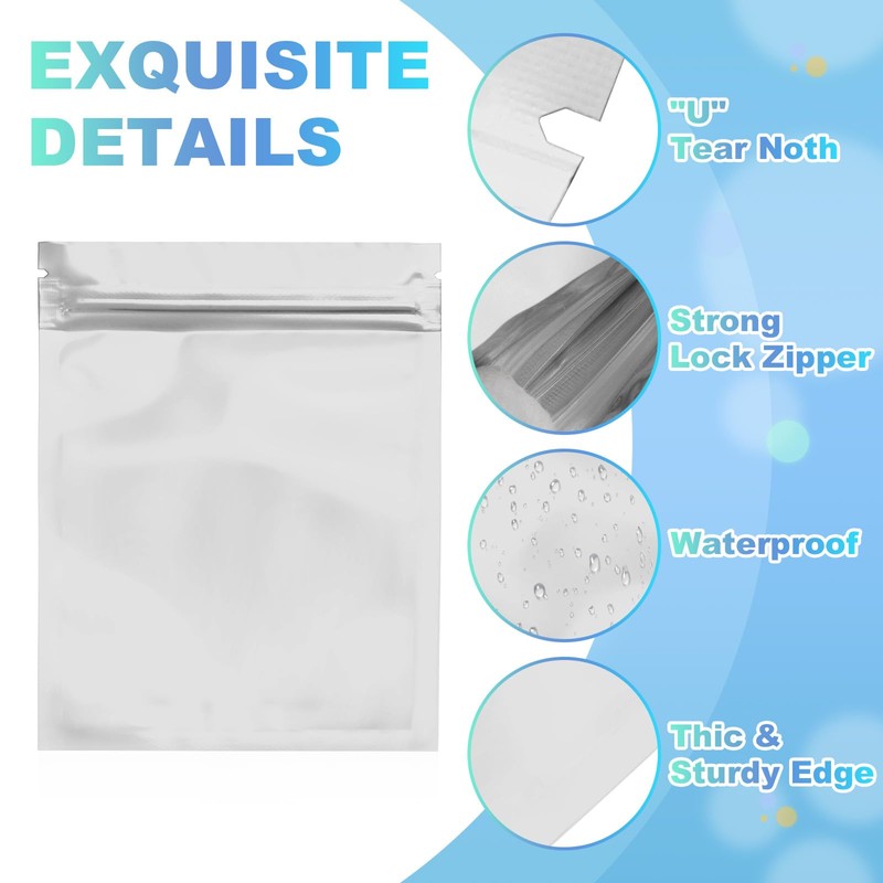 - Color: White; Material: Aluminum foil; Size: 10 x 15 cm/ 4 x 6 Inch; Package List: 100 Pcs x Self Seal Flat Pouch