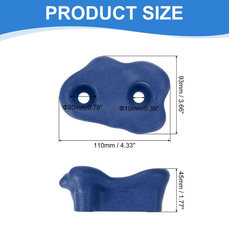 - Specification: Color: Blue-D; Material: Plastic; Size: 98 x 65 x 36mm / 3.86 x 2.56 x 1.42 Inch (L x W x T); Outer Screw Hole Diameter: 22mm / 0.87 Inch; Inner Screw Hole Diameter: 10mm / 0.39 Inch; Packing List:10 Pcs x Climbing Rocks. Each piece included: 2 Pcs x Half-threaded Screw (M8*74), 2 Pcs x Four-claw Nut, 2 Pcs x Metal Gasket