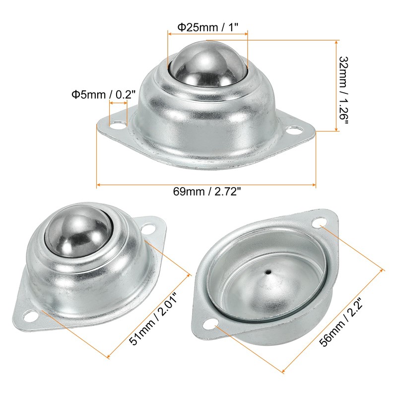 - Ball Diameter: 25mm / 1"; Install Hole Diameter: 5mm / 0.2 inch; Overall Size: 69x51x32mm / 2.72x2.01x1.26 inch(LxWxH); Package List: 4 x Roller Ball Transfer Bearing