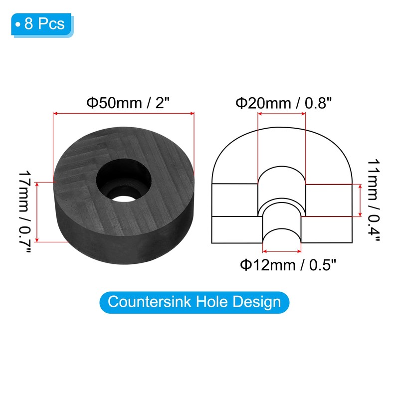 - Specification: Color: Black Material: Rubber Overall Size: 50 x 17 mm/ 2 x 0.7 inch ( OD*Thick) Inner Size: 20 x 11 mm/ 0.8 x 0.4 inch( ID 1#*Thick) Inner Diameter 2#: 12 mm/ 0.5 inch Packing List: 8 x Rubber Anti Vibration Foot Pad Bumper