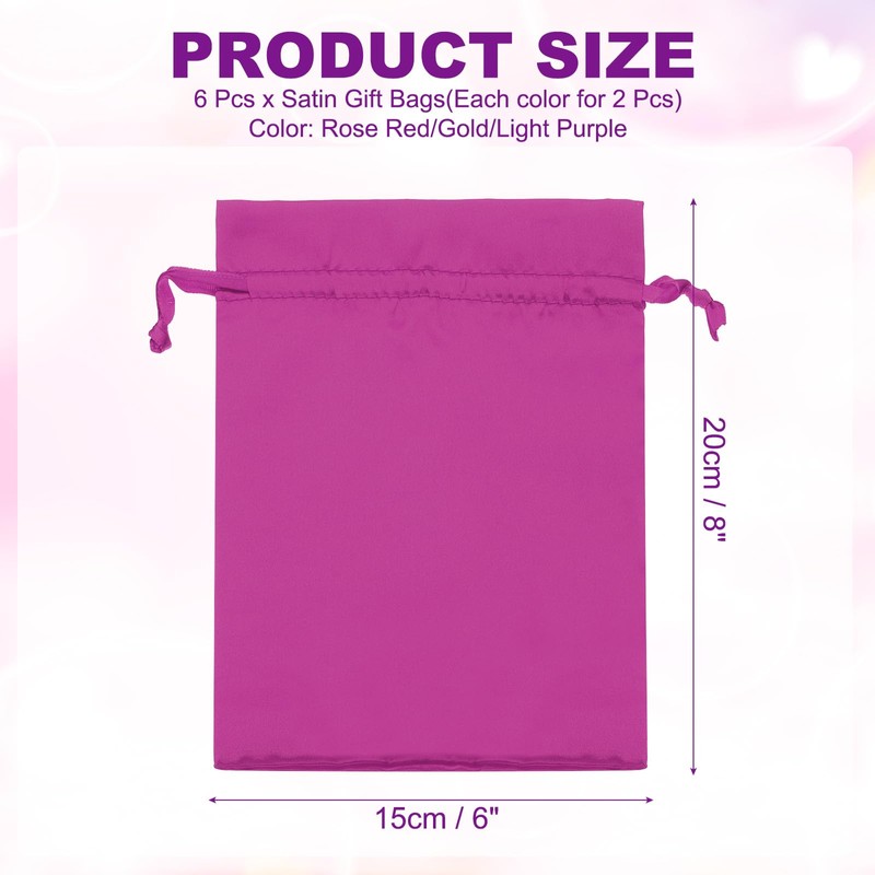 - Specification: Color: Rose Red/Gold/Light Purple; Material: Satin; Size: 20 x 15cm/8 x 6 Inch(L*W); Package List: 6 Pcs x Satin Gift Bags