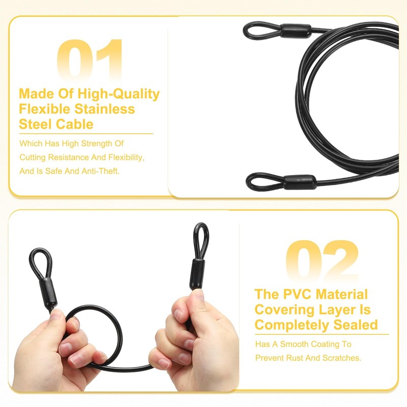 - Material: The bicycle cable lock is made of premium flexible stainless steel cable and PVC material, which has high strength of cutting resistance and flexibility, is not easy to slip and lose, and is safe and anti-theft.