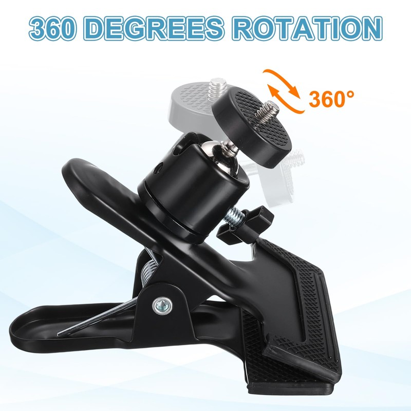- This Tripod Camera Clip Clamp can be easily fixed to such surfaces as desks, chairs, carts, workbenches, bicycle heads, or bedside tables. The tripod head adopts a standard 1/4"-20 UNC male thread interface, which is suitable for various accessories such as cameras, microphone clips, gooseneck lights, flash stands, mobile phones, tablet stands, light cantilever stands, hot shoes, etc., to meet diverse usage needs.