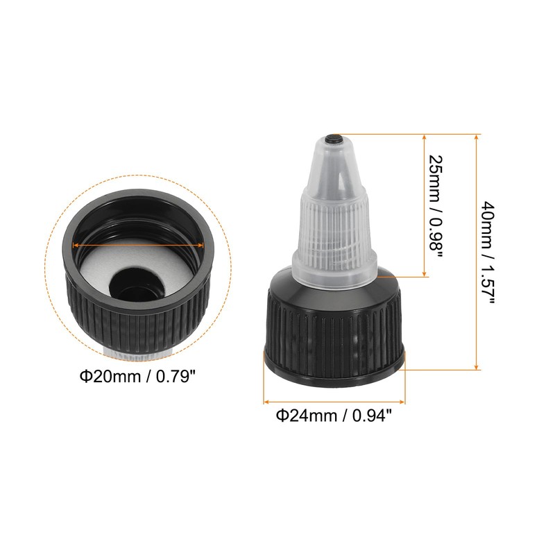 - Color: Black; Material: PP Plastic; Total Size: 24 x 40mm / 0.94 x 1.57 inch(D*H); Inner Diameter: 20mm / 0.79 inch; Tip Length: 25mm / 0.98 inch; Pack of 25Pcs Twist Bottle Caps