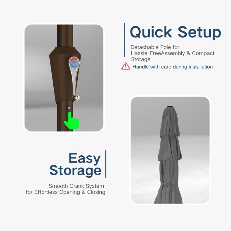 The 10FT diameter provides ample shade for 6-8 people, making it ideal for family gatherings, outdoor meals, and poolside relaxation. With the crank lift system and push-button tilt, you can easily adjust the canopy to block the sun at any time of day.