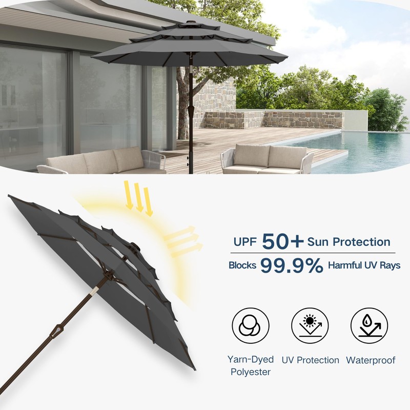 Transform your outdoor space with the 10FT 3-Tier Patio Umbrella. Designed for optimal sun protection and superior wind resistance, this umbrella is perfect for creating a comfortable, shaded area in your garden, patio, pool area, or deck.