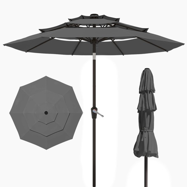 Patio Kingdom 10FT Patio Umbrella 3 Tiers Outdoor Market Umbrella w/Push Button Tilt, Crank, UV and Waterproof Table Umbrella for Garden, Pool, Backyard, Deck, Lawn, Grey