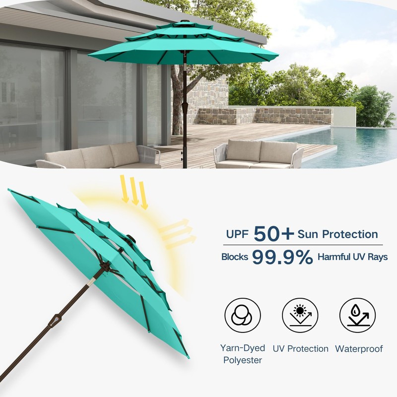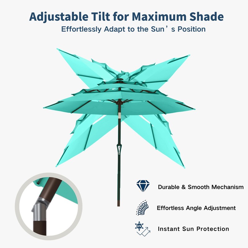 Transform your outdoor space with the 10FT 3-Tier Patio Umbrella. Designed for optimal sun protection and superior wind resistance, this umbrella is perfect for creating a comfortable, shaded area in your garden, patio, pool area, or deck.