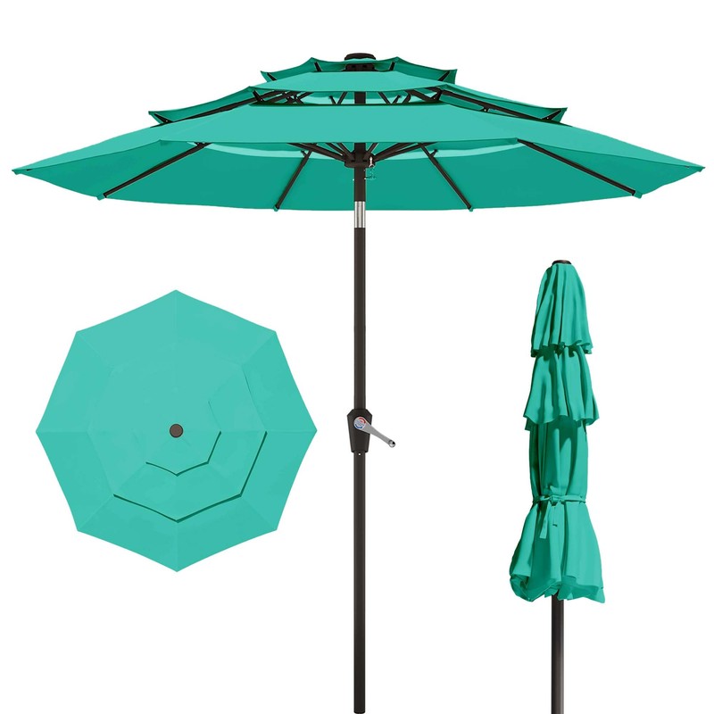 Patio Kingdom 10FT Patio Umbrella 3 Tiers Outdoor Market Umbrella w/Push Button Tilt, Crank, UV and Waterproof Table Umbrella for Garden, Pool, Backyard, Deck, Lawn, Turquoise Blue