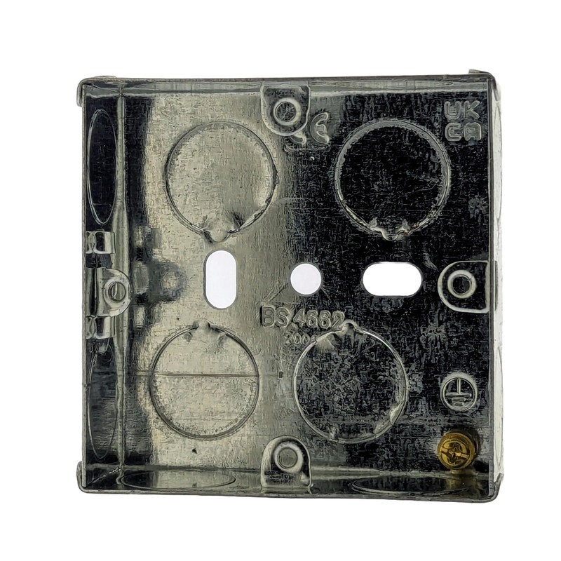 - DIMENSIONS: 25mm deep single galvanised steel back box designed for flush mounting with standard UK electrical fittings