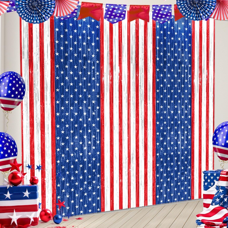 - package includes: our patriotic party decorations includes 2 packs of red white blue foil fringe curtains, the size of each patriotic party tinsel curtain backdrop is 3.3 ft x 8.2 ft, enough length for hanging on a door or covering a wall fully, suitable for any parties. these red white blue birthday backdrop scintillating fringe curtains are the perfect touch to elevate your event
