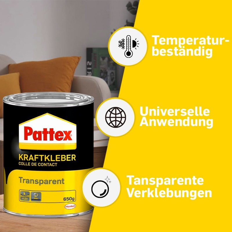 Pattex Kraftkleber Transparent, extrem starker Kleber für höchste Festigkeit, Alleskleber für den universellen Einsatz, hochwärmefester glasklarer Klebstoff, 1 x 650g