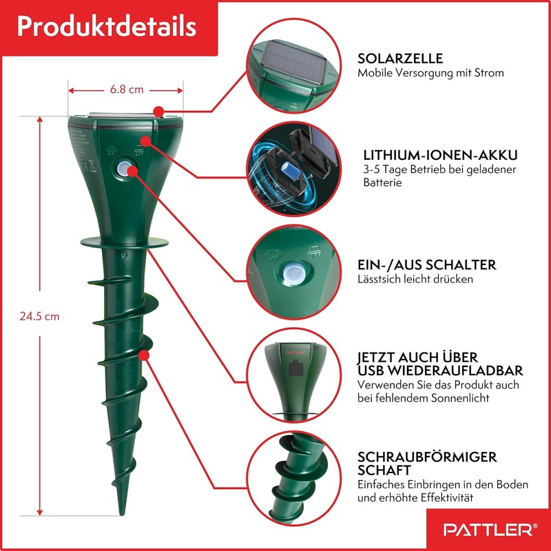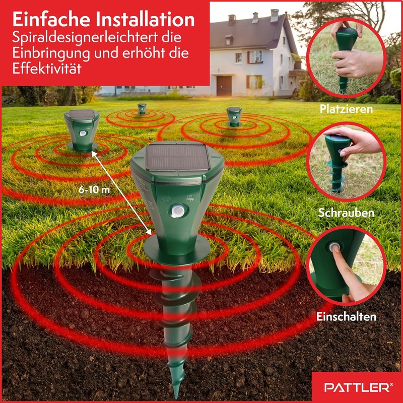 • Increased effect thanks to screw design: the PATTLER mole deterrent has an innovative design, which emits the sound waves more effectively into the environment. The devices cover up to 800 m² in combination.