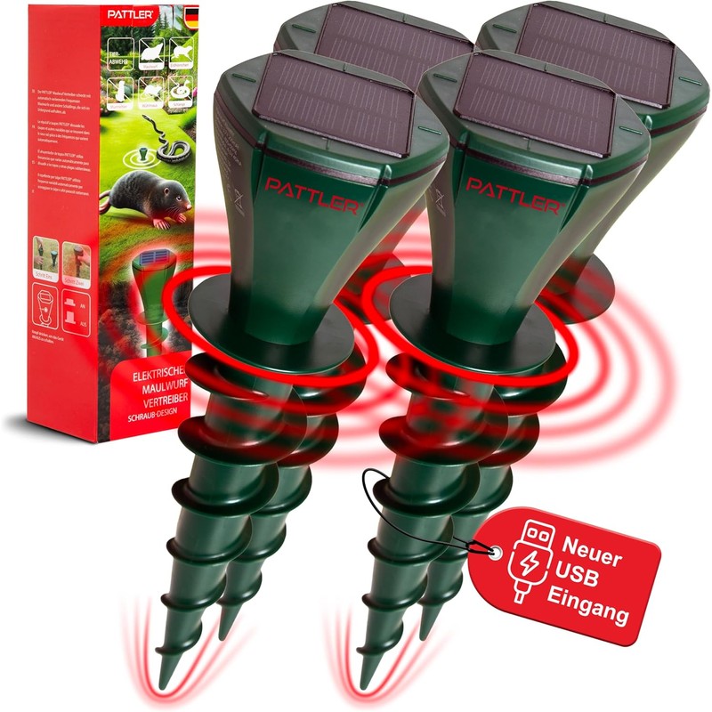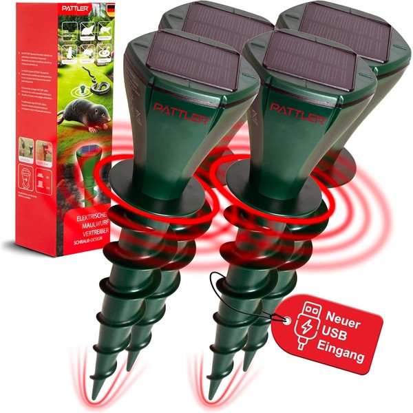 PATTLER® Mole Repeller Set of 4 – Effective Mole Repel on Approx. 800 m² – Flexible Use Thanks to Solar Panel – Innovative Screw Design Increases Effectiveness