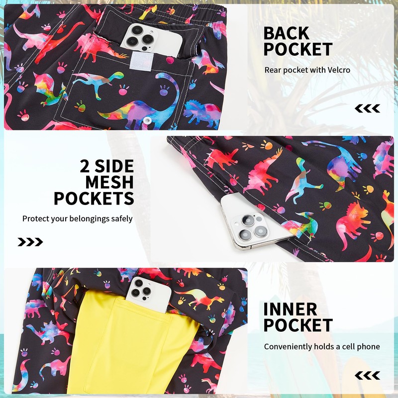 - Upgrade Pocket Design: Featuring 2 side pockets and 1 back pocket with velcro closure, 1 compression lined pockets for extra storage small items. Modern fashion style and slim fit swimshorts. Men, youth, the elderly, the sexy and the energetic can all enjoy a cool board shorts men's.