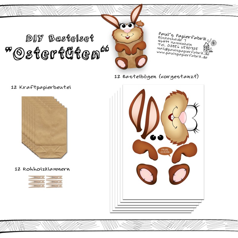 Paul´s Papierfabrik 12 Cute Easter Bags Easter Bunnies for Easter Nest for Crafts and Filling Yourself All Parts Pre-Cut - DIY without Scissors
