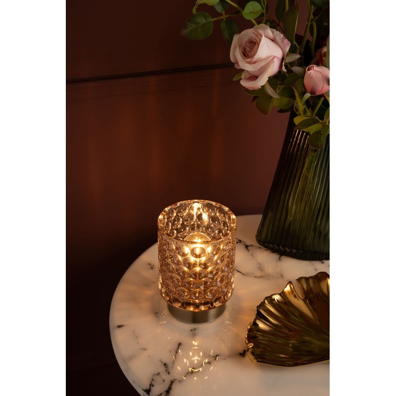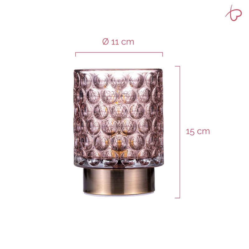 With its tasteful glass in a delicate rose, the Bright Glamor table lamp sets wonderful lighting accents in living or sleeping areas. The stylish structure of the glass and the brass-colored lamp base? make this table lamp a special decorative highlight. It particularly develops its elegant effect on the dining table during an evening dinner and as an eye-catcher on shelves or chests of drawers. There it creates a pleasant lighting atmosphere. Battery operation allows you to place the mobile table lamp anywhere and at any time - regardless of whether there is a power connection nearby. The table lamp switches off automatically thanks to the 6 hour timer. Our tip: Several of these lights look best next to each other on larger tables, such as the dining table. Note: Please note that no batteries are included (3 x AA).