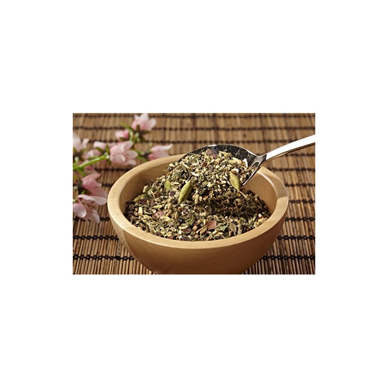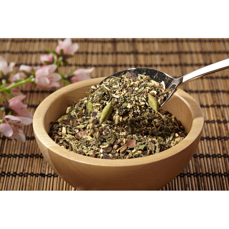 - Ayurveda tea kapha with ginger, black pepper, fennel, nettle leaves, coriander, balm, cocoa shell, cardamon pod