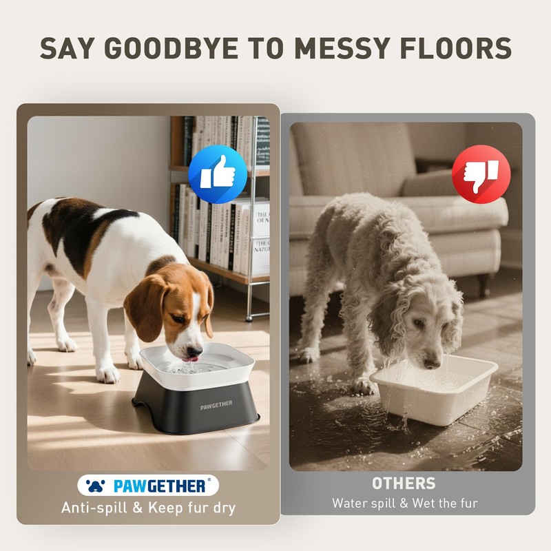DOUBLE ANTI-SPLASH TECH: A 1.57-inch raised rim teams up with a unique one-piece floating disk. As your dog drinks, water flows through small base openings—reducing spills by 90%. Say goodbye to soggy floors!