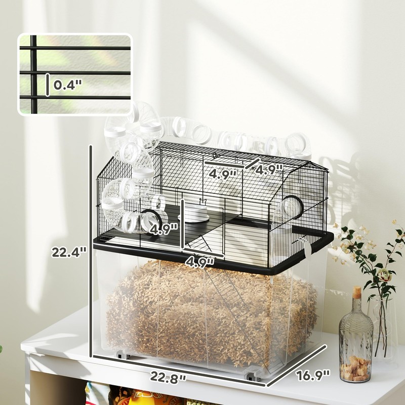 PawHut Large Hamster Cage with 12" Deep Tray, 2 Tier Gerbil Cage with Tube System, Water Bottle, Ramp, Feeding Bowl, 23" x 17" x 22", Black