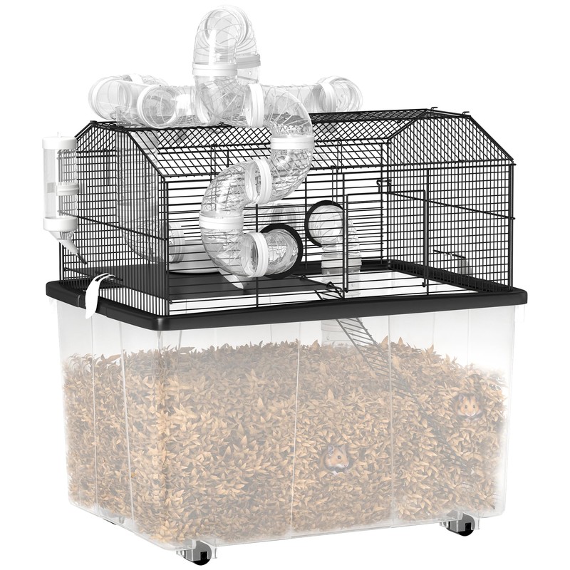 Discover the PawHut hamster cage, a spacious 2-tier world with a tube system for endless exploration. This large hamster cage features an 11.8" deep tray, ensuring a playful yet tidy habitat. It comes with all the essentials: perch, ramp, water bottle, and food dish, making it a delightful haven for any dwarf hamster or gerbil. Plus, it's easy to move with handy bottom wheels!