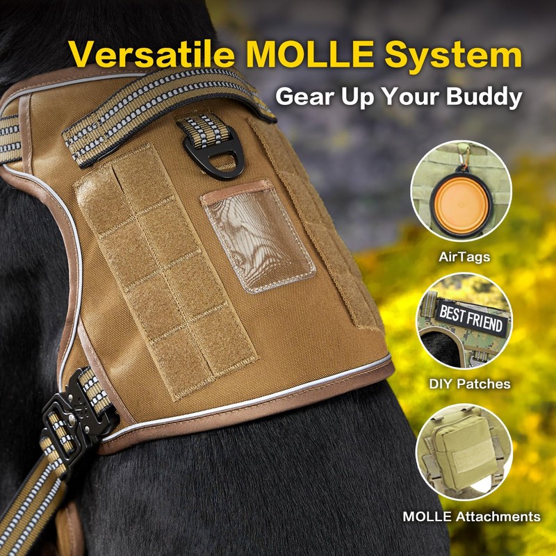 - Versatile and Mission-Ready MOLLE System: Our dog harness for small dogs is equipped with MOLLE strips for carrying essential gear, including poop bags for responsible pet ownership to easy cleanup on the go, first-aid kits to handle minor injuries while away from immediate help, and AirTags to ensure your dog can be quickly located if they wander off.