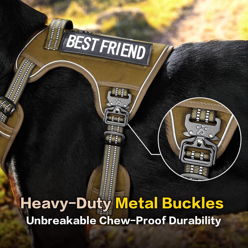- Chew-Proof Metal Components: Unlike other dog harnesses equipped with plastic buckles, our dog harness small sized dog is made with all-metal components, providing unbeatable chew-proof durability. Thanks to its strength, our tactical dog harness ensures your furry friend stays secure, preventing escapes caused by broken buckles or D-rings.