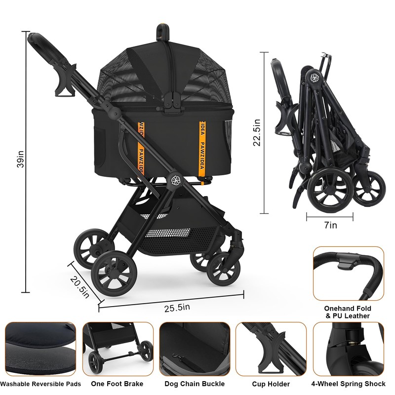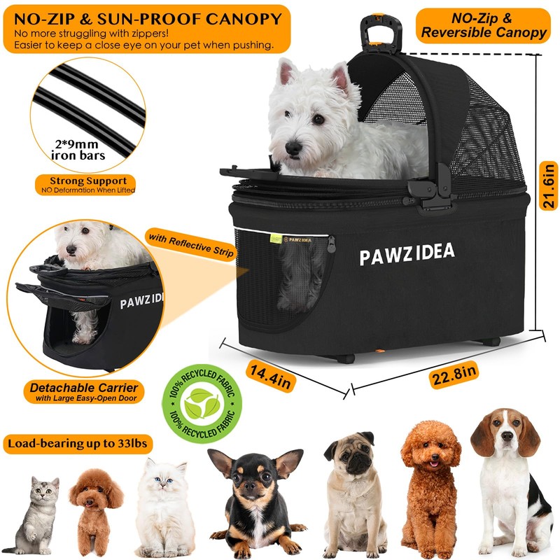 - 4-IN-1 Pet TRAVEL SYSTEM -Pet Stroller + Detachable Travel Carrier + Seatbelt Dogs Booster Car Seat Combo + Dogs/Cats House. Removable and washable canopy and seat cushion. Pet stroller with removable carrier with a larger easy-open zipper door allows your fur-kids to get on and off the puppy stroller freely.