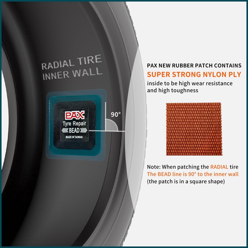 - 【2-in-1 New Tire Patch】The patch contains "Super Strong Nylon Ply", specially designed for bias and radial tires, 2-in-1 patch is very economical and affordable. *Note: To repair the radial tire, align the BEAD baseline and stick it at an angle of 90° to the tire's inner wall. When the BEAD baseline is turned at an angle of 45° and the patch forms a diamond shape, it can be used as a bias tire patch.
