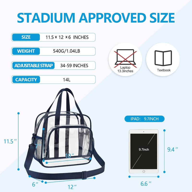 - 【 Multi-use Clear Bag】Rectangular shape making it easy to place in between the seats, suitable for casual daily wear, stadium events, concert, sports, work, travel and any other occasions.