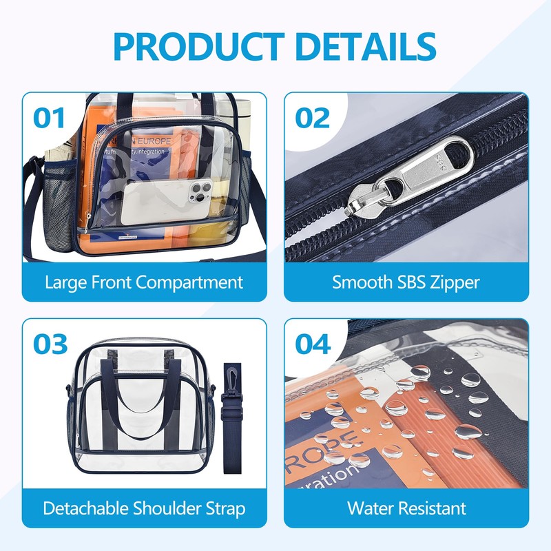 - 【Water Resistant】The PVC material makes this clear bag water resistant. No more worries of a sudden rain or splashing water, and it's easy to clean. Note: Do not immerse the bag in water to prevent water from entering the clear bag through the zipper.