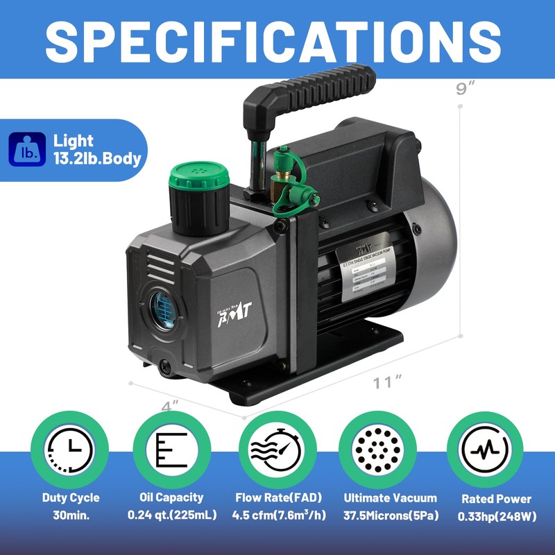 - [Powerful Vacuum Pump] Our vacuum pump is designed with a powerful motor with the copper construction, serving at a 4.5CFM flow rate; and the housing is made of reinforced aluminum alloy, which offers good heat dissipation and avoids any corrosion. It provides durable construction and effective operation for years of use. The 1/4 in. SAE & 3/8 in. SAE intakes can fit different sizes of connection ports of hose.
