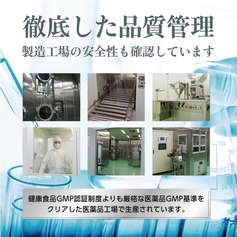 - 健康食品GMP認証制度よりも厳格な、「GMP基準」をクリアした国内工場(許可番号 AZ000136)にて原料の管理から製造まで安心してお使いいただく為の厳しい環境下で製造している健康補助食品です。