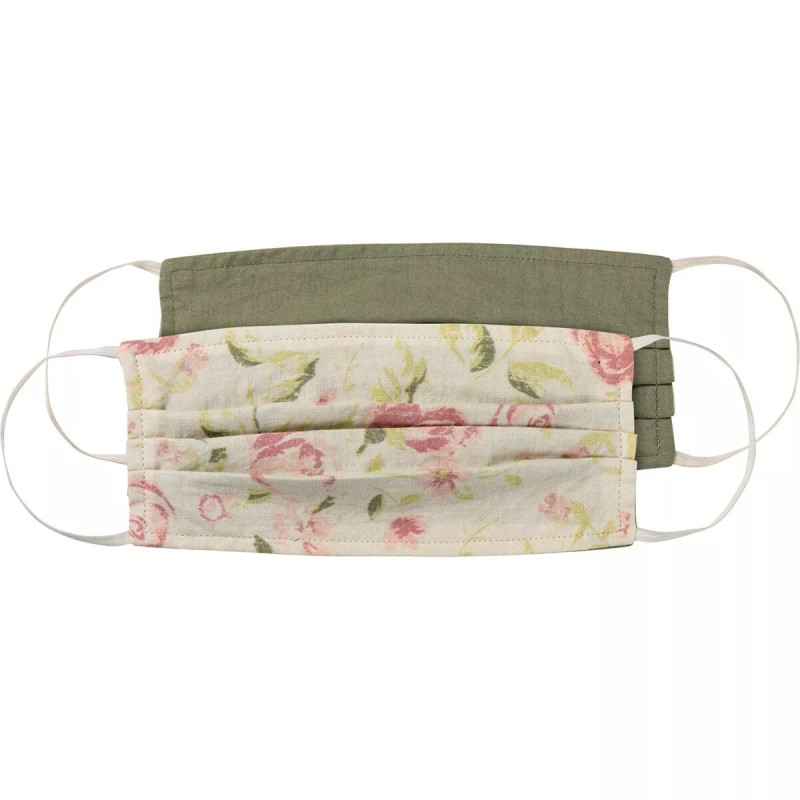 A two-ply pleated cotton face mask with elastic ear loops for ultimate comfort. This mask is reversible with a vintage floral pattern on the front and a solid color on the back. One size fits most. Our masks are machine-washable and reusable. Intended for general, non-medical purposes. Not a replacement for medical grade personal protective equipment (PPE).
