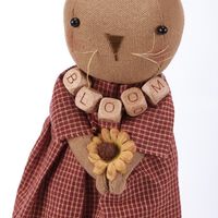 This is a whimsical primitive rabbit doll holding a flower with a plaid dress and wooden bead details spelling out "Bloom" sentiment. This Bloom Bunny doll includes string on back so it can sit or hang. Dimensions:3.50" x 12" x 3"Primitive Spring Easter Bunny Bloom Doll w/ Flower 12"