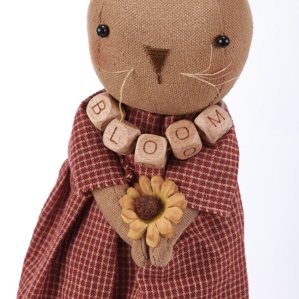 This is a whimsical primitive rabbit doll holding a flower with a plaid dress and wooden bead details spelling out "Bloom" sentiment. This Bloom Bunny doll includes string on back so it can sit or hang. Dimensions:3.50" x 12" x 3"