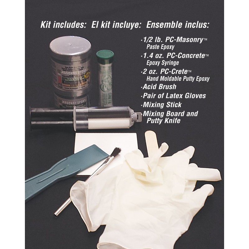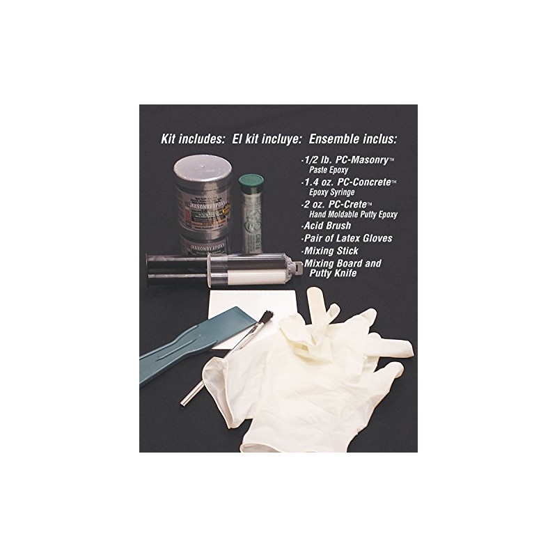 Rebuild missing concrete and masonry, fill cracks, anchor and much more. Rebuild steps, anchor bolts and railings, repair bird baths, reface spalled concrete. Kit includes the essentials you will need; Latex gloves, mixing board, mixing and applying tools, PC-Crete 2oz hand moldable putty epoxy (3 minute work time and cures in 1 hour), 1.4 oz PC-Concrete (work time 10 minutes and cures in 4 hours), 8 oz PC-Masonry anti skid Epoxy paste (work time 10 minutes and cures in 4 hours). All products may be applied in wet conditions, and are suitable for both interior and exterior projects.