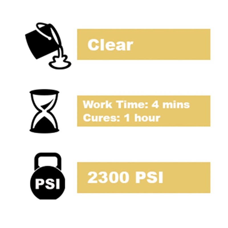 • Provides work time of approximately 4 minutes, cure time for function of 1 hour, and full cure time of 24 hours