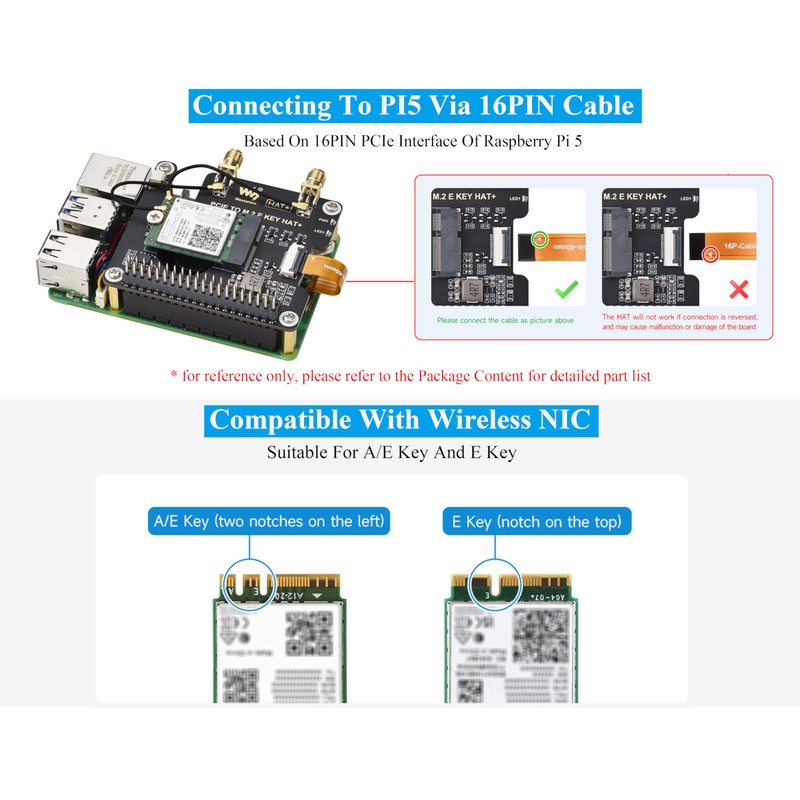 • This is PCIe To M.2 E KEY HAT, Compatible with Raspberry Pi 5. Compatible With Various NGFF (M.2 E Key) Wireless NIC, Supports USB Bluetooth Connection And HAT+ Standard.
