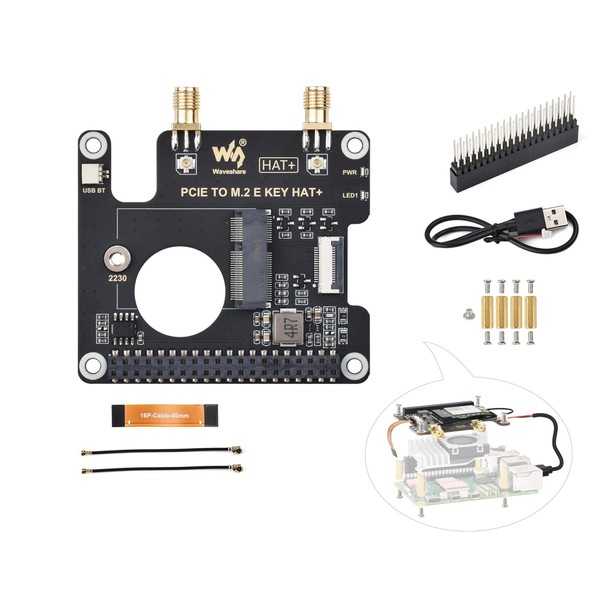 PCIe to M.2 E Key HAT Compatible with Raspberry Pi 5, Pi 5 PCIe HAT Support Various NGFF (M.2 E Key) Wireless NIC, Supports USB Bluetooth Connection, HAT+ Standard