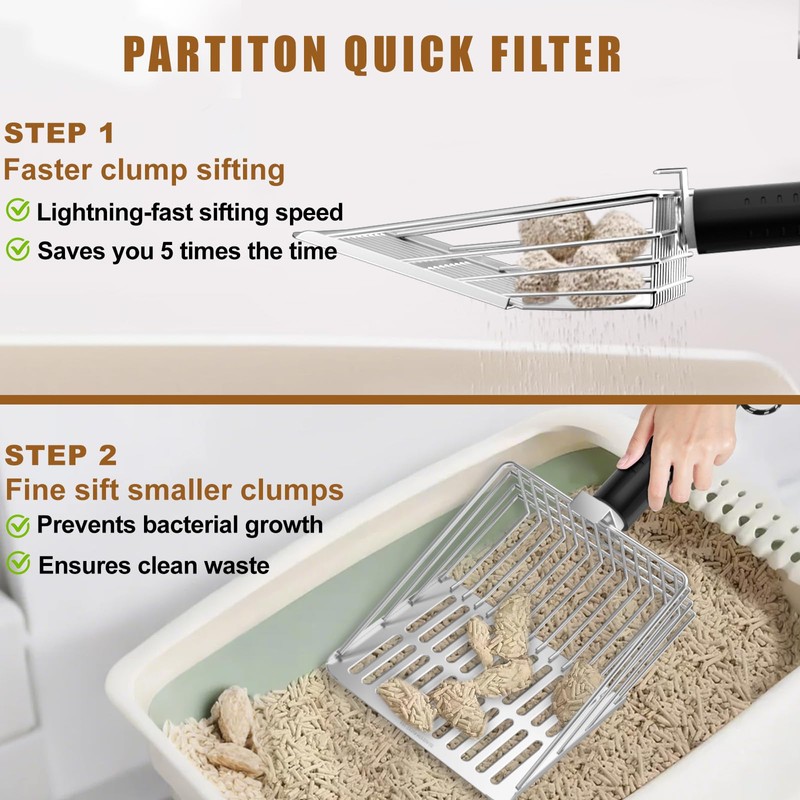 - Innovative Mesh Design: The front scoop features a fine mesh for filtering small litter particles, while the back scoop has a larger mesh for quickly clearing larger waste, meeting the needs of a cat litter box scooper