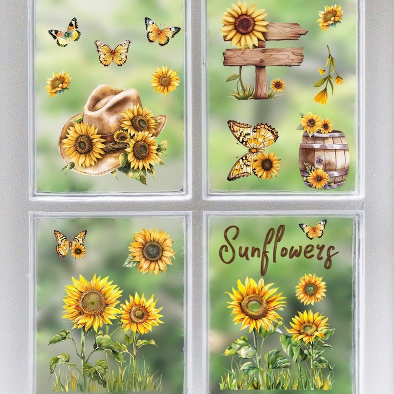 - 🌻Easy to Apply: 7.9"x11.8"Sunflowers and Garden Patterns(include sunflowers, butterflies, hat, gnome and more) Static Cling Window Sticker-No messy adhesives or sticky remnants! Choose your ideal patterns to DIY and simply peel and stick these static cling stickers onto your windows for an instant makeover. Perfect for renters or homeowners looking to refresh their space