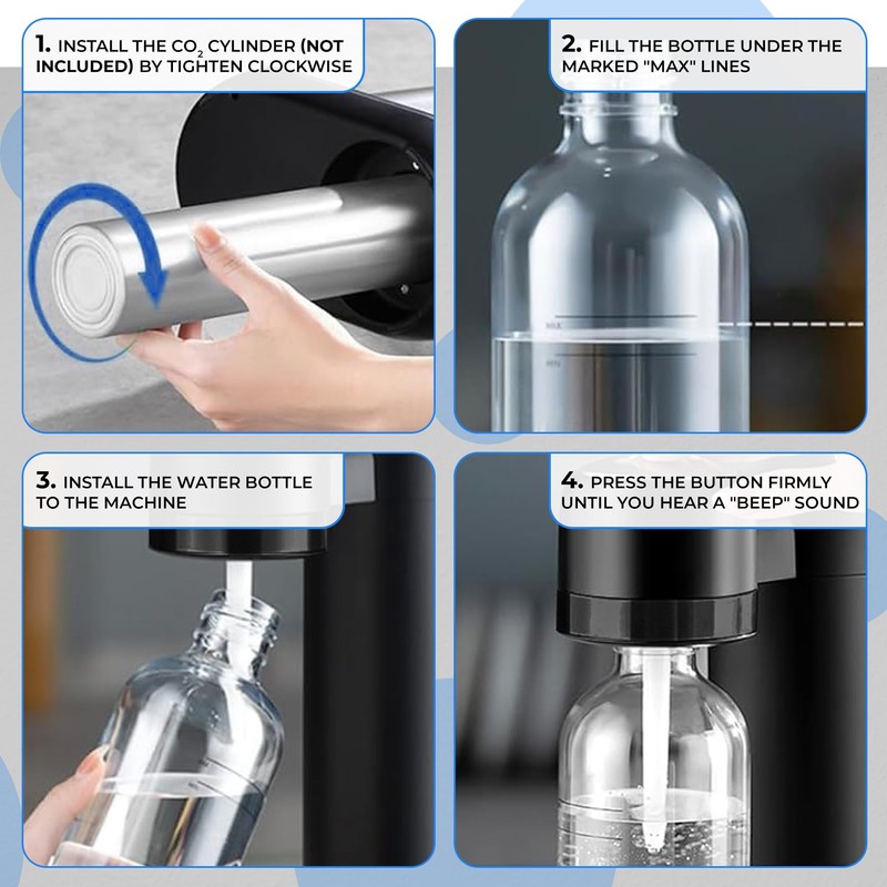 - ✔️ Safe & Durable: Included with the sparkling water machine is a 1L (33.8 fl-oz) BPA-free water bottle, ensuring your drinks remain free from harmful chemicals. Lightweight and durable, it's perfect for staying hydrated on the go. featuring an airtight seal sealed lid to maintain carbonation.