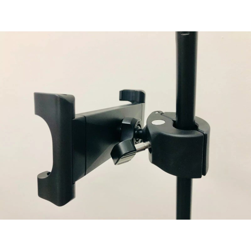 The device holder is extendable, and can be open from 5 1/4” to 11 1/4” (134mm to 285mm). The round clamp can hold onto a tube with a diameter from .7” to 1.25” (18mm to 32mm). It can also attach on to any flat surface that it can fit around. A great add-on to your music stand and mic stand!