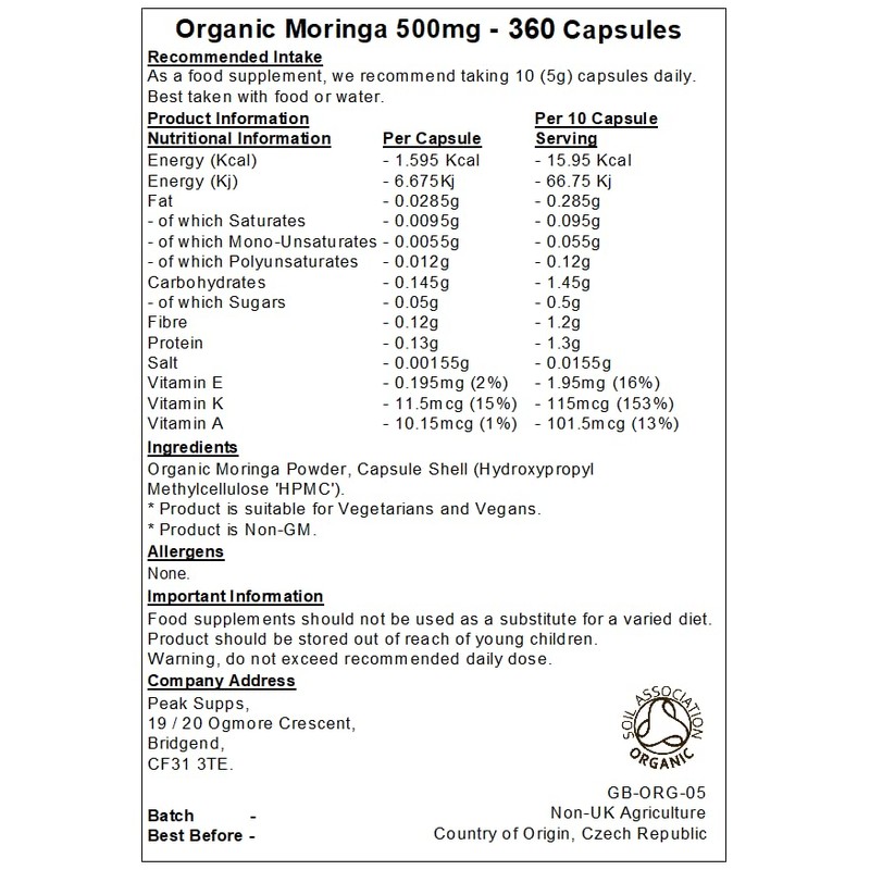 Peak Supps Organic Moringa 500mg - 360 Capsules
